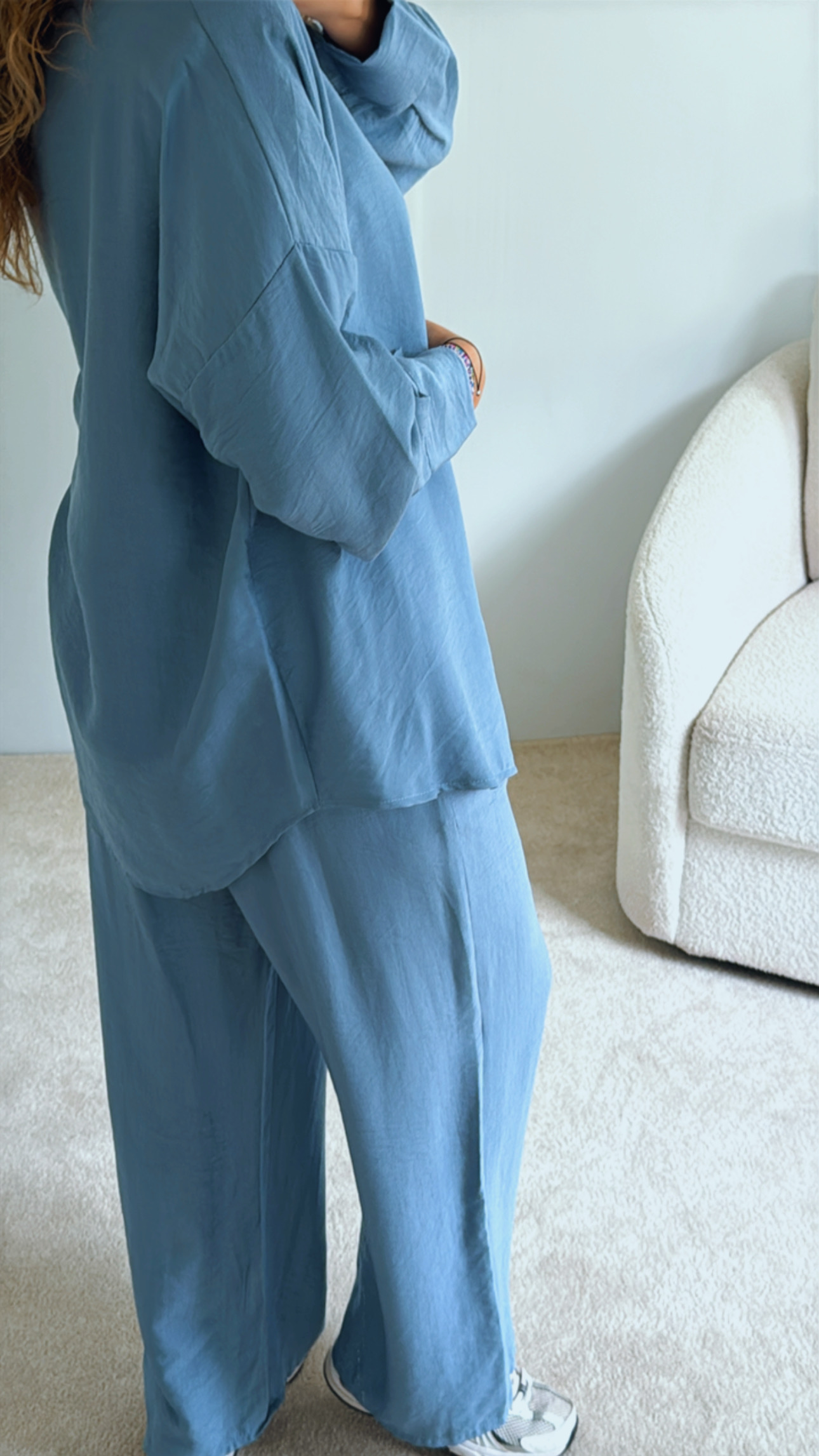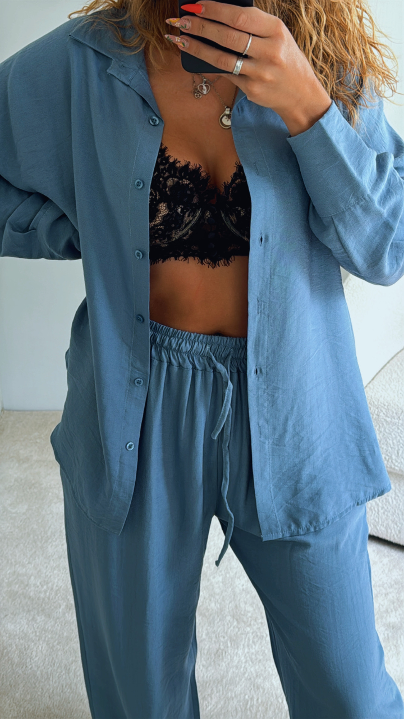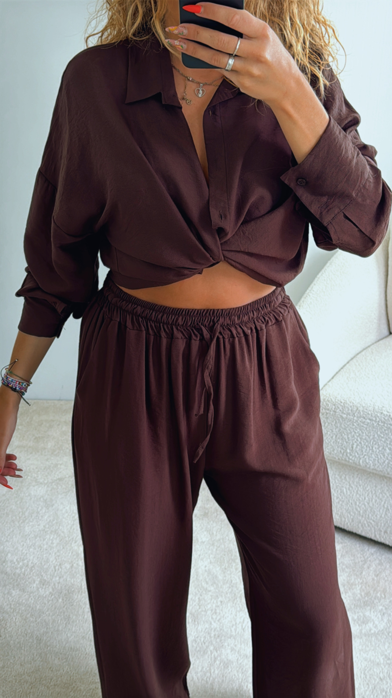 Conjunto composto por camisa + calça Camisa oversize, aperta de botões, Calças cinta super subida, elásticas e ajustáveis de nó/laço, Tecido tipo linho, leve e confortável Serve S até XXL , Modelo veste M/38 , 1,68cm de altura