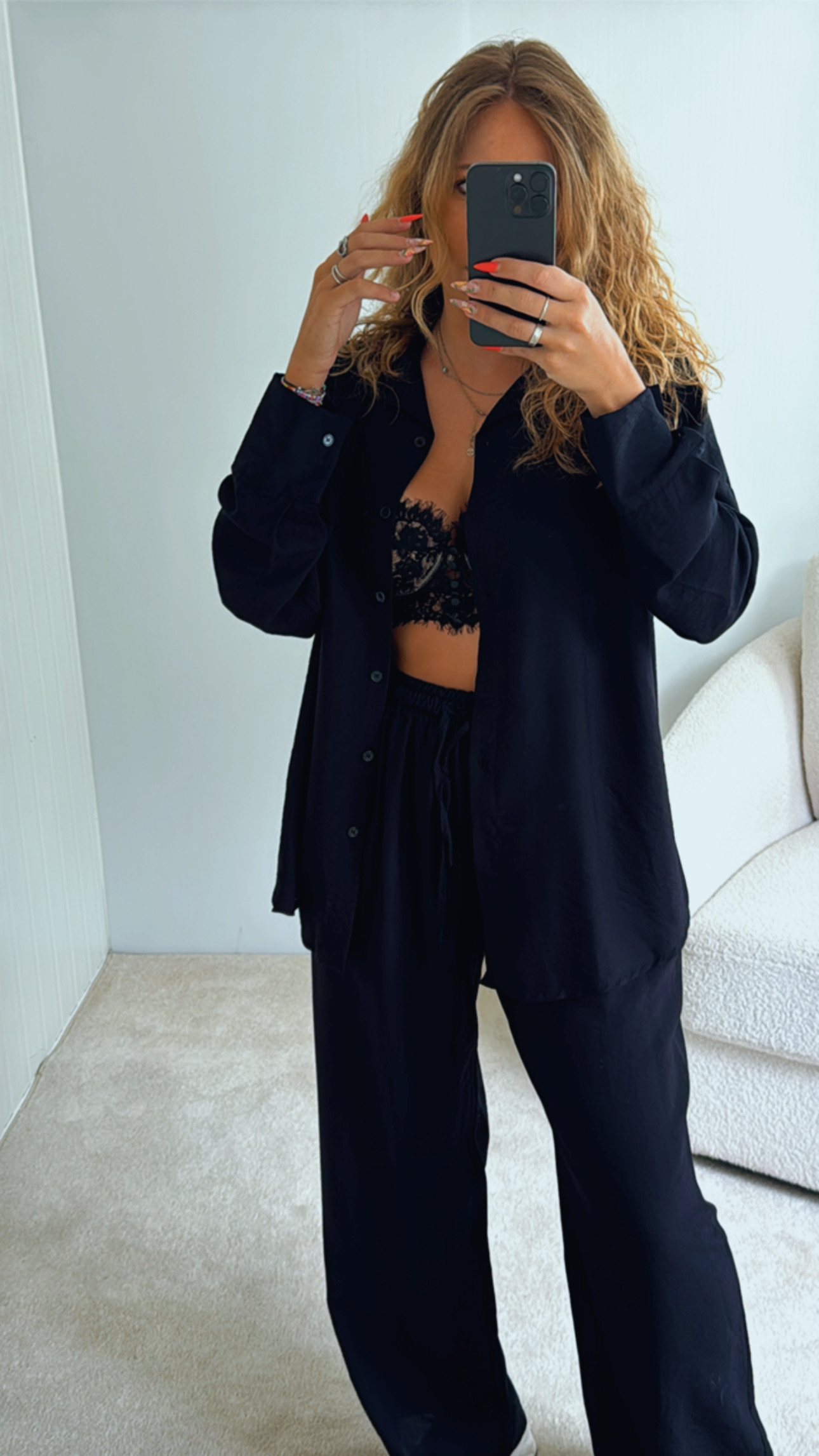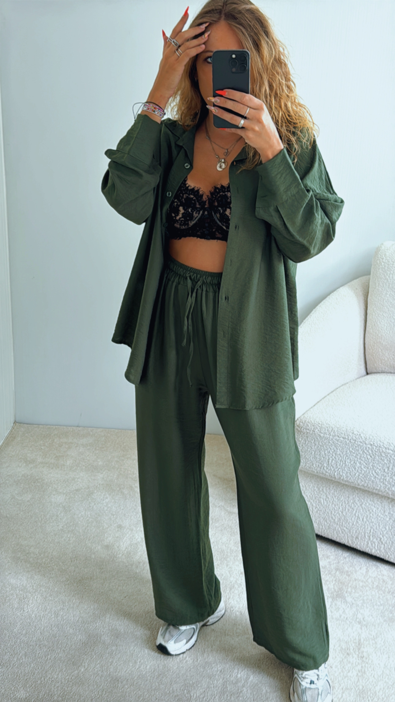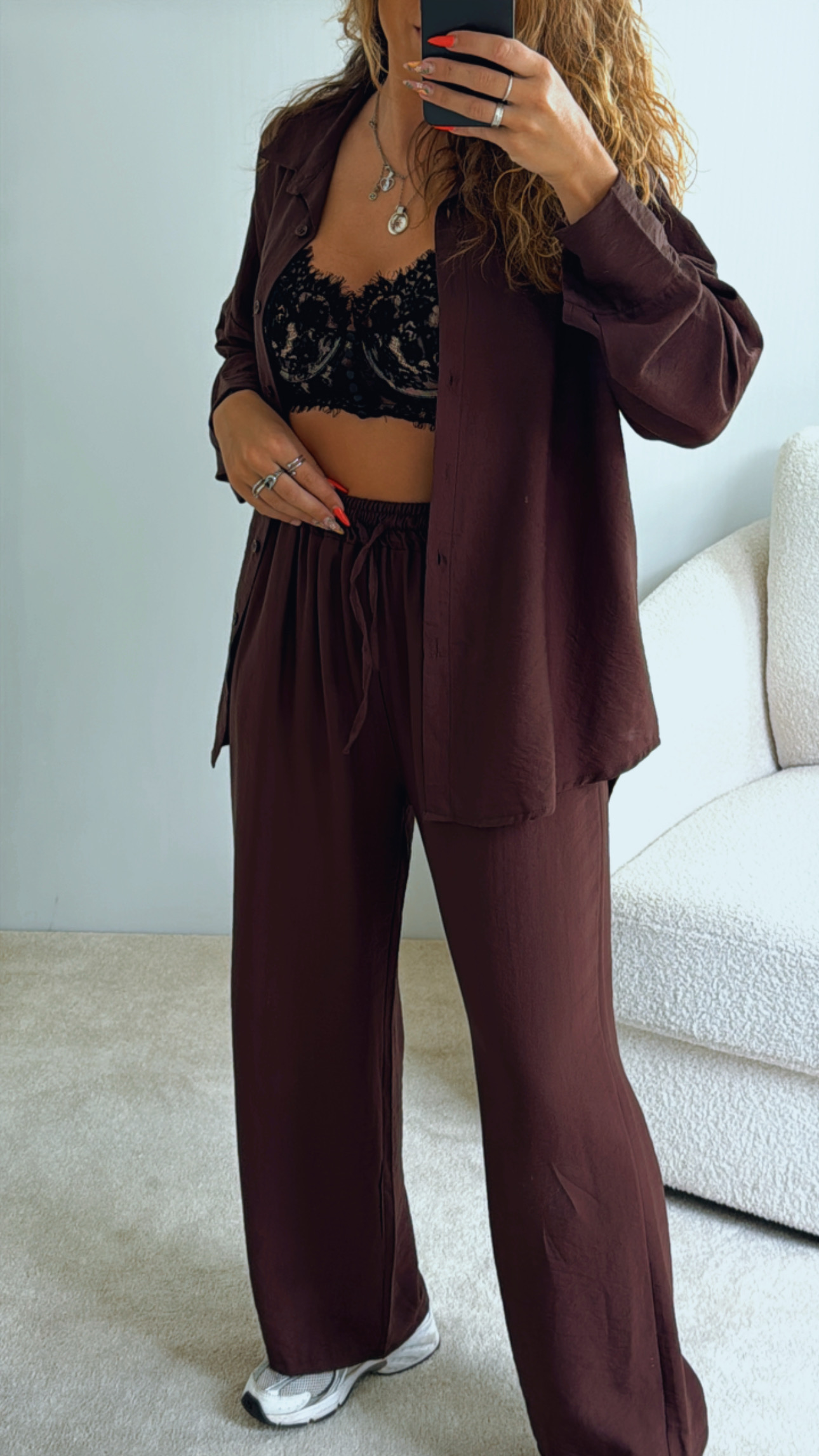 Conjunto composto por camisa + calça Camisa oversize, aperta de botões, Calças cinta super subida, elásticas e ajustáveis de nó/laço, Tecido tipo linho, leve e confortável Serve S até XXL , Modelo veste M/38 , 1,68cm de altura