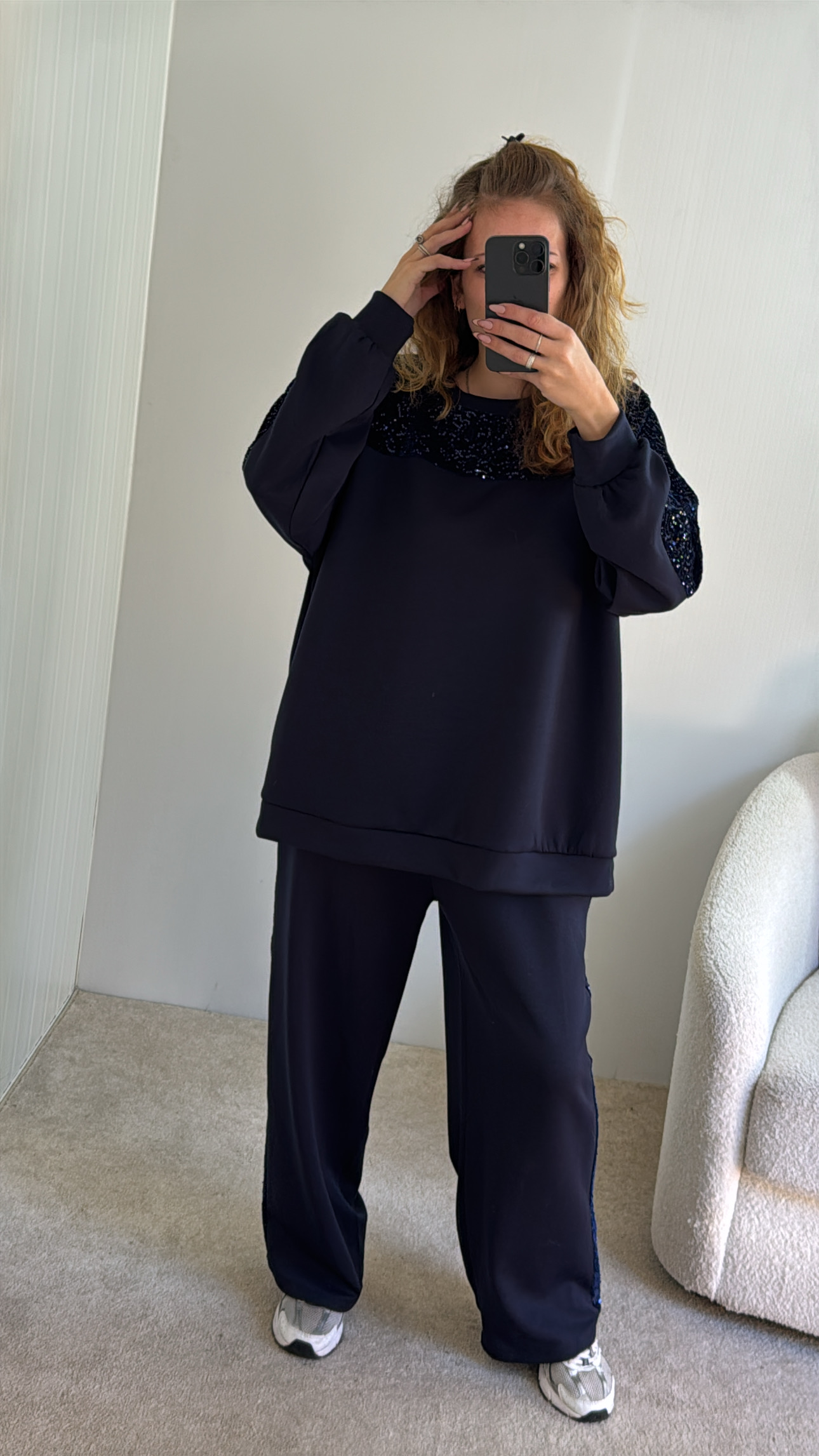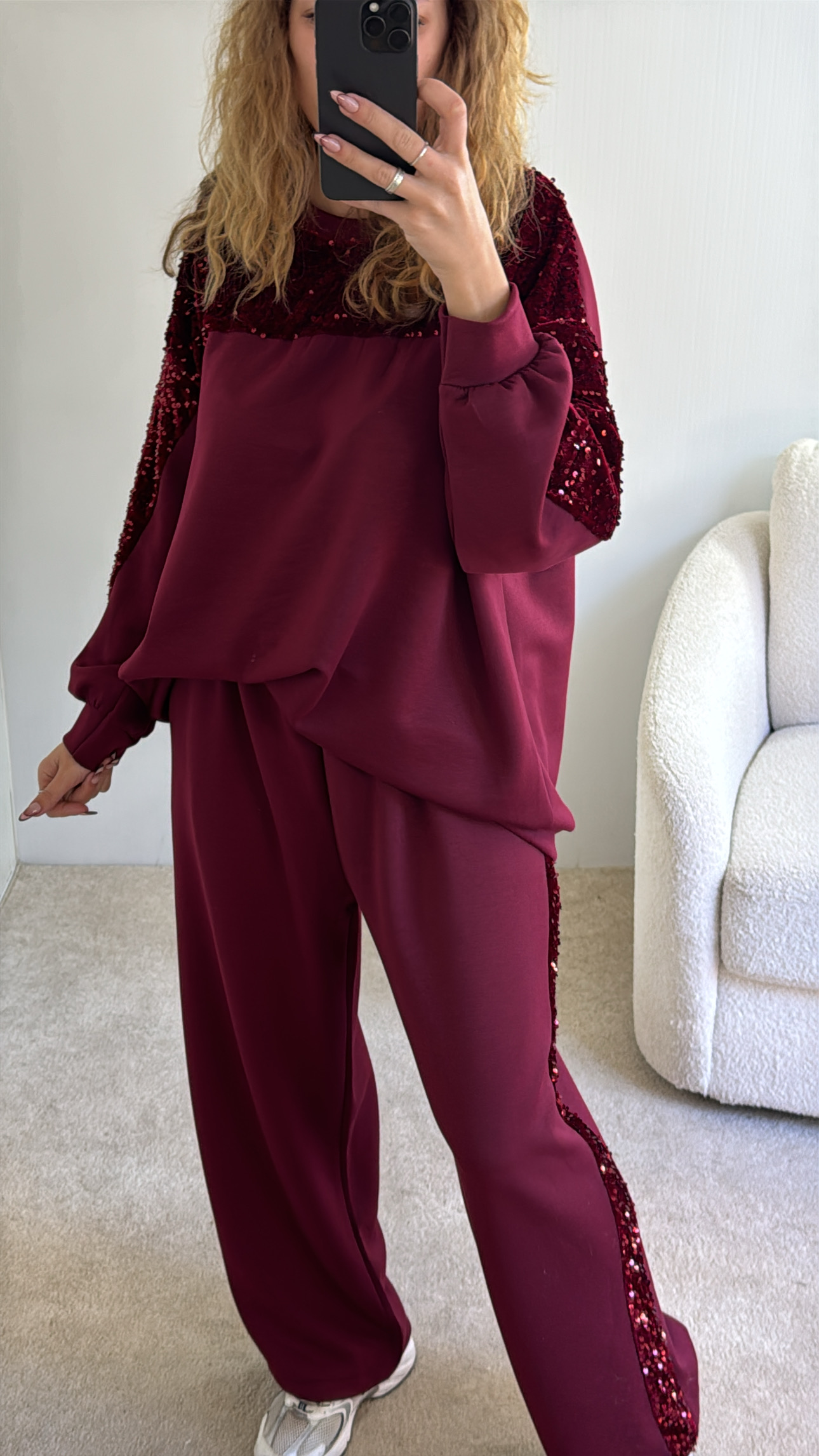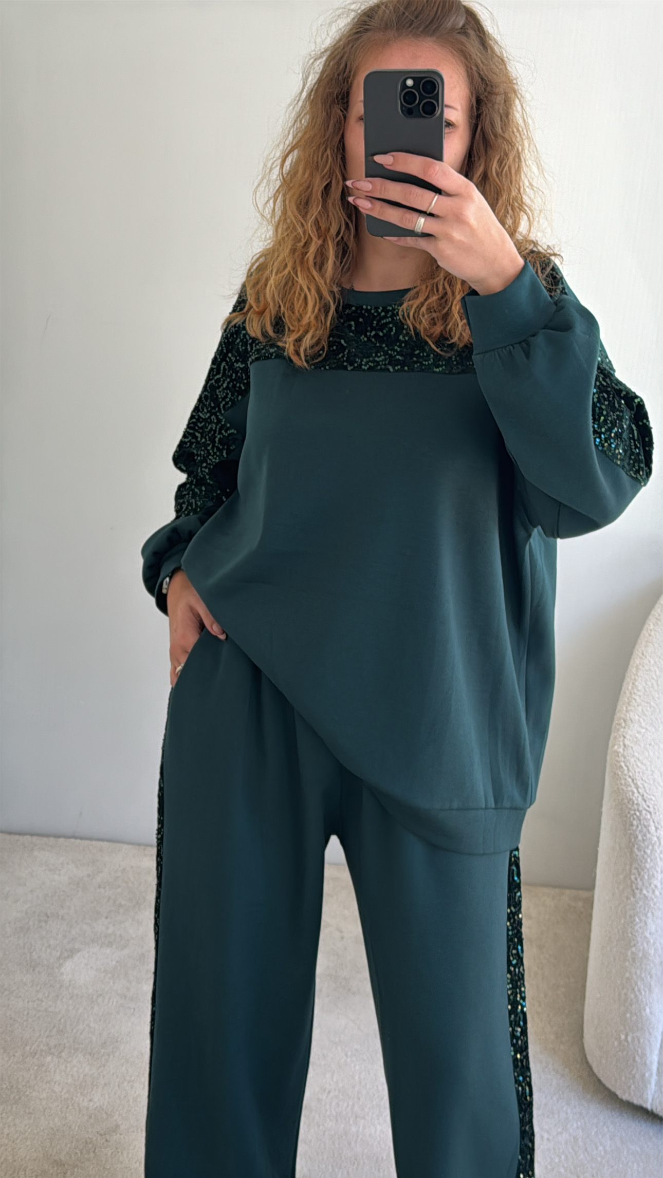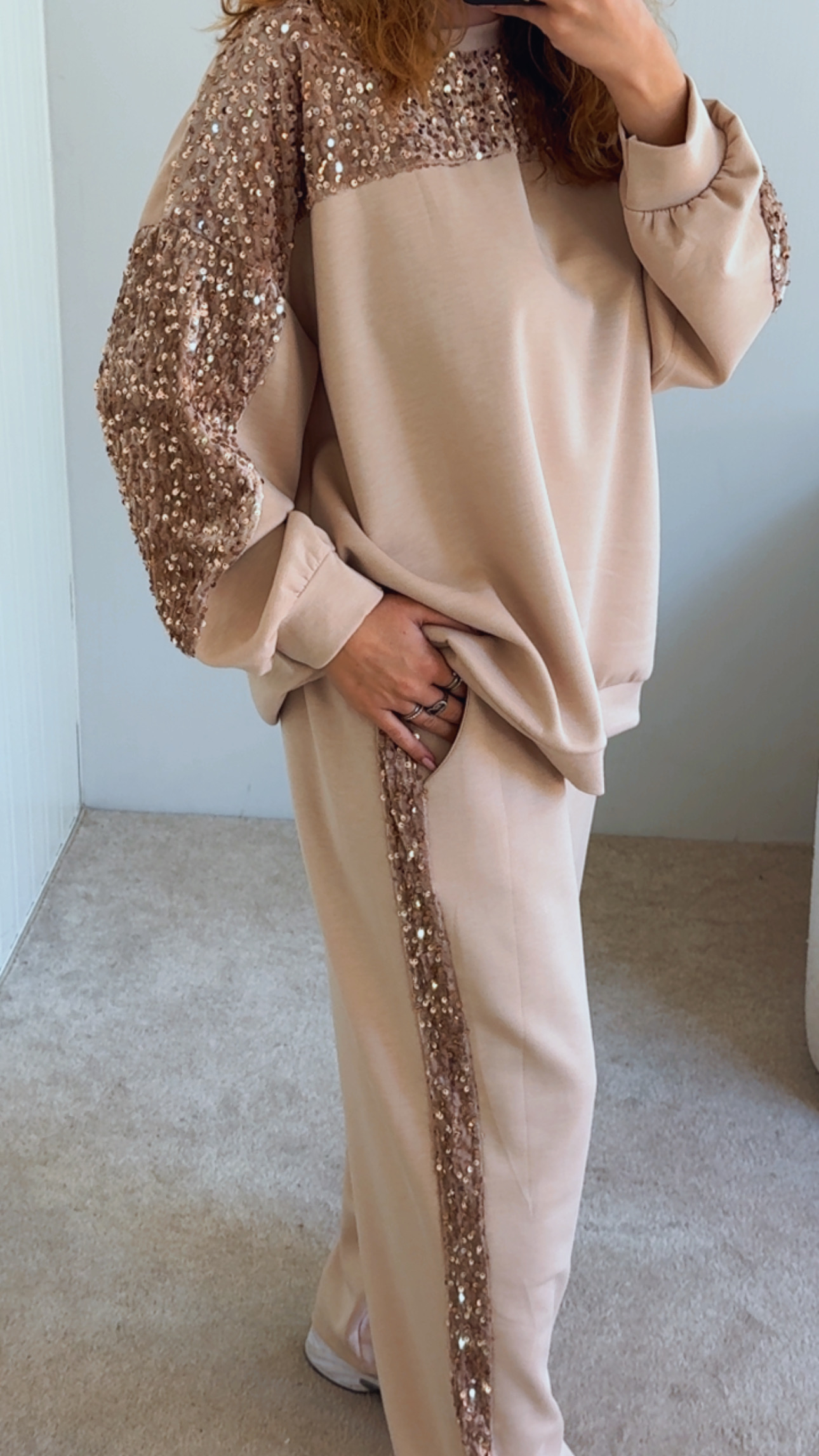 Conjunto composto por camisola e calça Calça cintura subida, com boloss e lantejoulas de lado , Camisola com lantejoulas perto da gola Veste SM sté XXL , modelo veste SM , 1.68cm