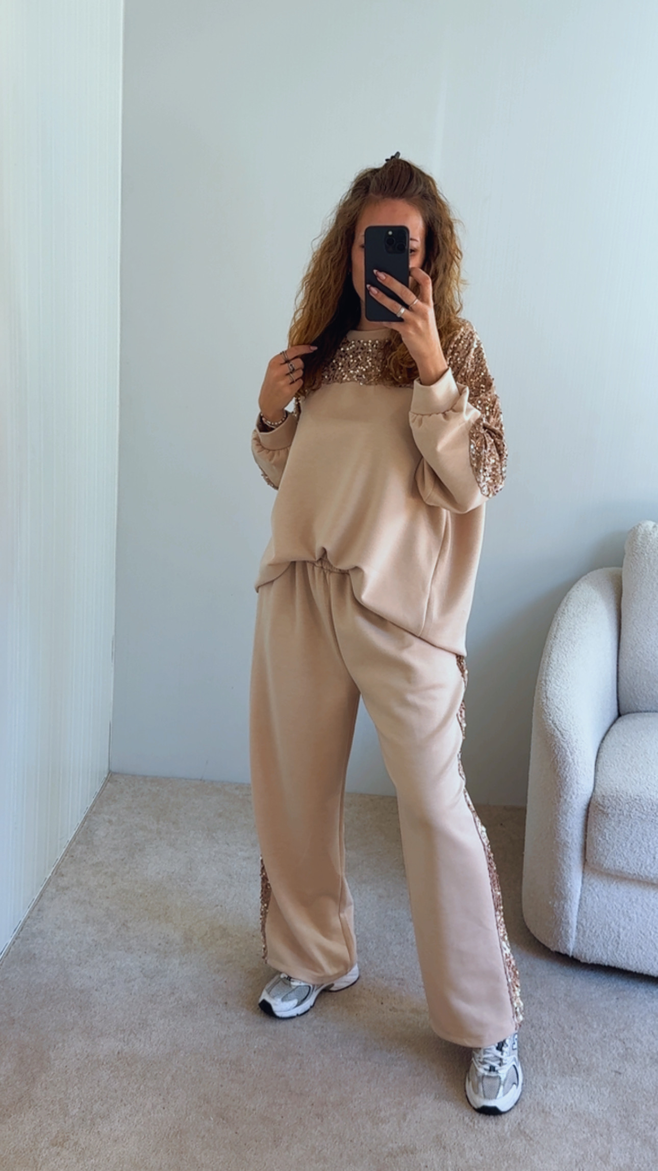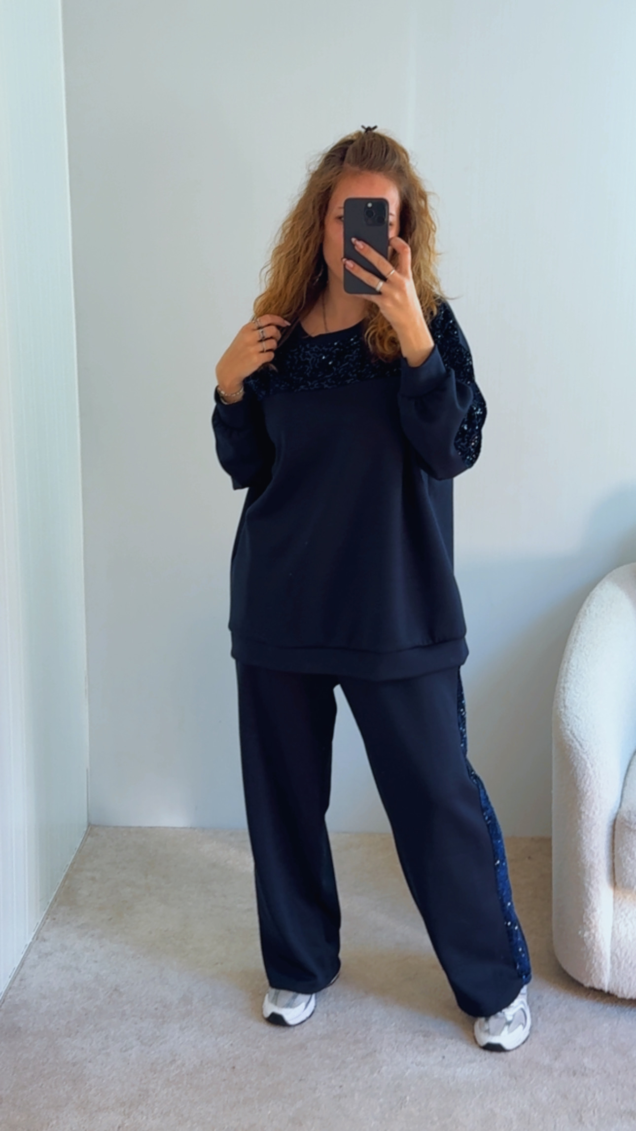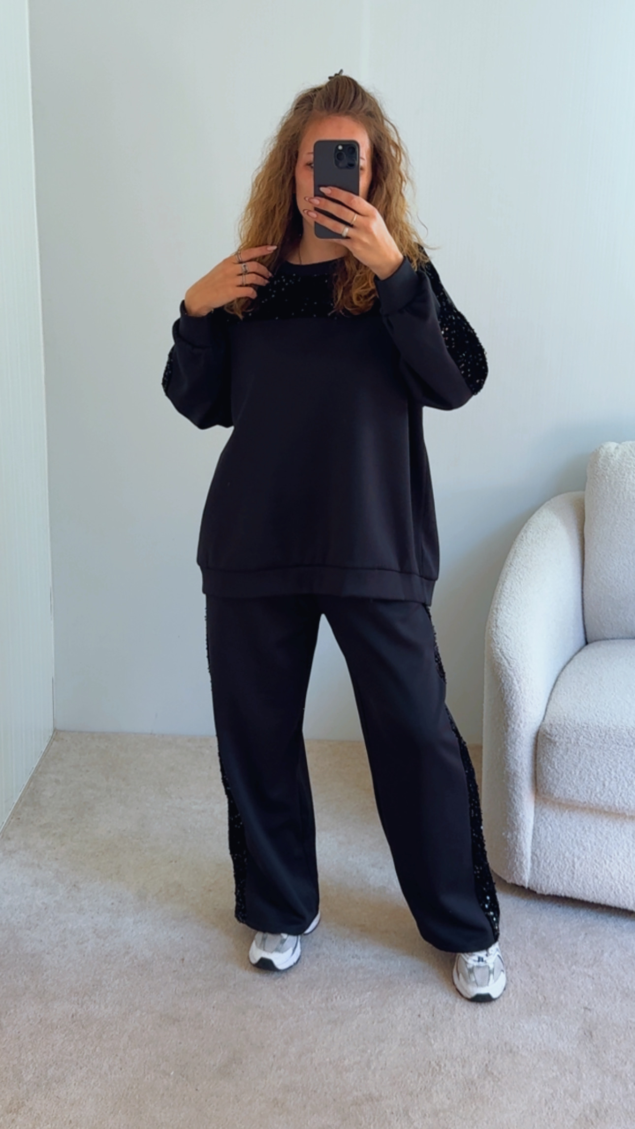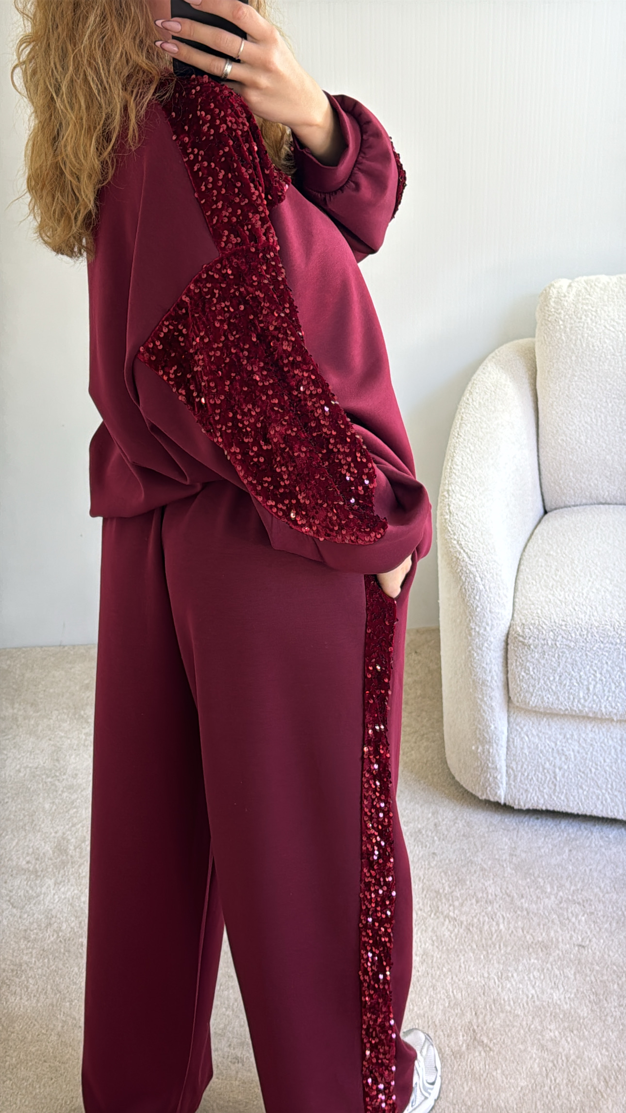 Conjunto composto por camisola e calça Calça cintura subida, com boloss e lantejoulas de lado , Camisola com lantejoulas perto da gola Veste SM sté XXL , modelo veste SM , 1.68cm